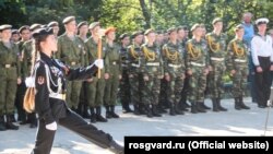 Пресс-служба Росгвардии утверждает, что выставка образцов вооружения и экипировки российского подразделения «заинтересовала школьников».