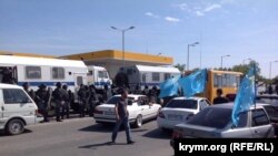 Как сообщает корреспондент Крым.Реалии, который стал очевидцем данных событий, сотрудники ОМОНа в полной боевой экипировке, с щитами перегородили выезд колонны автомобилей с крымскотатарскими флагами.