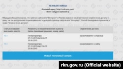 На сайте Роскомнадзора отмечается, что решением Генеральной прокуратуры России от 25 сентября 2015 года ограничивается доступ к Крым.Реалии, а решением от 30 сентября того же года ограничивается доступ к странице сайта.