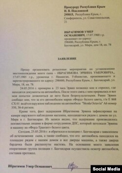 Ибрагимов отметил в заявлении, что 25 мая обратился в полицию Бахчисарая с заявлением об исчезновении сына. По его словам, в полиции он сообщил, что автомобиль его сына, Эрвина Ибрагимова находился на площадке рядом с домом, дверцы машины и бардачка были раскрыты.