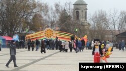 В Керчи 17 февраля на центральной площади Ленина отметили Масленицу, выставив гигантские фанерные балалайки и матрешки, а также информационные стенды о строительстве Керченского моста и трассы «Таврида».