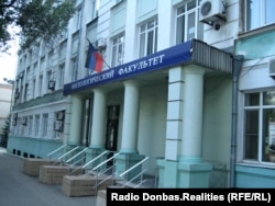 Вход в филологический факультет Донецкого национального университета. До 2016 года на фасаде размещался барельеф украинскому поэту Василию Стусу, под которым часто оставляли живые цветы, даже во время оккупации. Боевики его демонтировали.