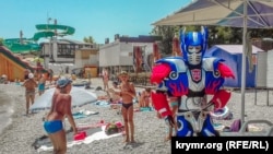 Отдыхающих на пляже развлекают аниматоры. Одного из них мы встретили в костюме трансформера.