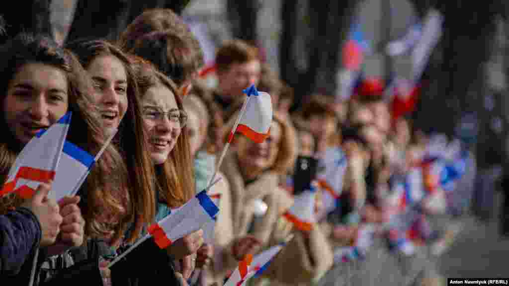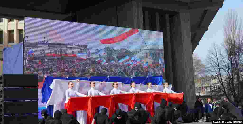 В Симферополе 15 марта прошли официальные мероприятия, посвященные пятилетию российской аннексии Крыма. В рамках празднования состоялись праздничное шествие и митинг. Торжество началось с возложения цветов к памятнику «Народному ополчению всех времен» у здания крымского правительства. В мероприятиях приняли участие глава российского правительства Крыма Сергей Аксенов, спикер российского парламента Крыма Владимир Константинов, спикер российской Госдумы Вячеслав Володин, депутаты российской Госдумы, адмирал Олег Белавенцев, который получил звание героя России за «Крымскую весну». А также руководитель «ДНР» Денис Пушилин, и экс-депутат французского парламента Тьерри Мариани. Все это время из динамиков звучало: «Крым, Россия навсегда – наша крымская победа!»