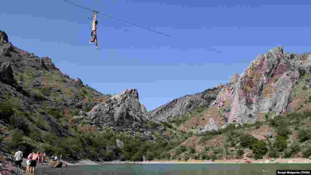 В урочище Панагия близ Зеленогорья развлечением для отдыхающих является «тарзанка» – на определенной высоте над озером натянут трос, по которому можно прокатиться от одного конца водоема до другого.