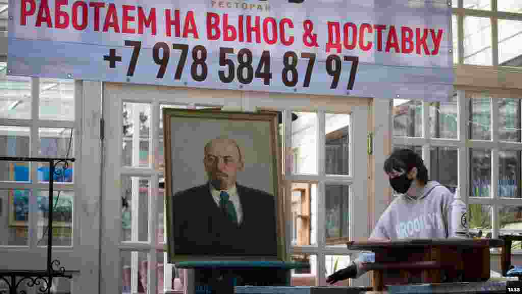 Портрет Владимира Ленина на входе в одно из заведений на набережной Ялты. В связи с пандемией коронавируса российские власти Крыма ввели на полуострове режим «повышенной готовности»: с 28 марта по 5 апреля закрыто множество заведений, в том числе кафе и рестораны. У некоторых, как на фото, можно заказать доставку.