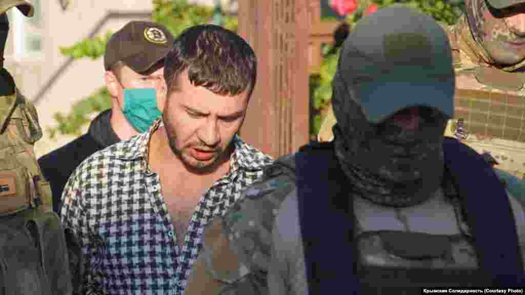 Нижнегорский район: сотрудники ОМОНа выводят из дома журналиста «Крымской солидарности», корреспондента «Грани.ру» Айдера Кадырова. Утром 31 августа в российские силовики пришли в его дом и забрали крымчанина в управление ФСБ в Симферополе.