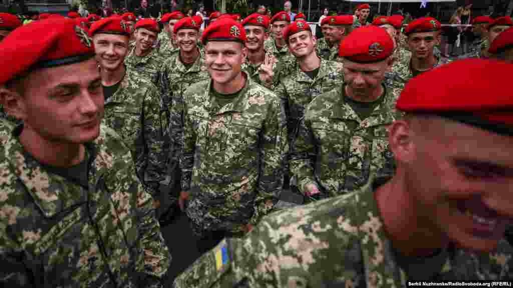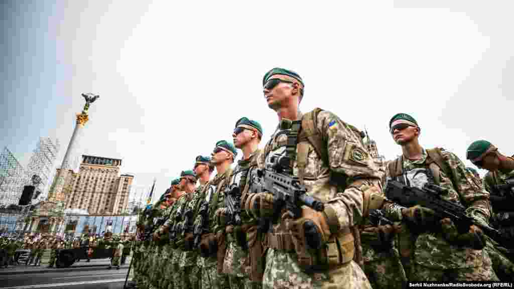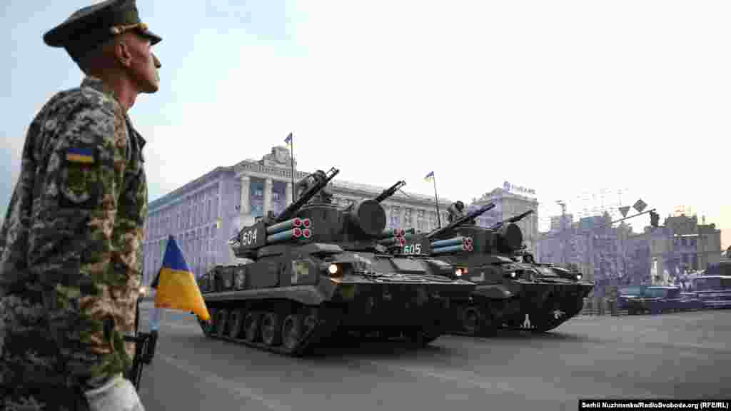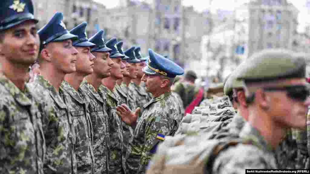 На главной улице украинской столицы – Крещатике – состоялась вечерняя тренировка личного состава, который традиционно привлекают к военному параду ко Дню Независимости Украины. В этом году страна будет праздновать 27-ю годовщину.