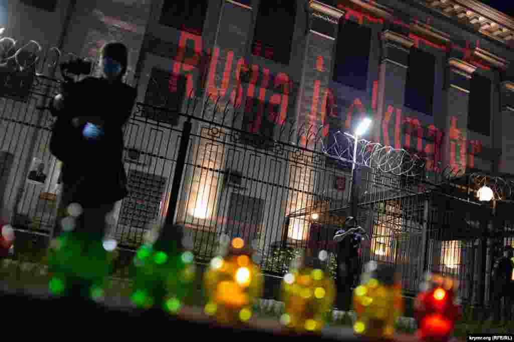 Активисты призывали прекратить аннексию Крыма, развернули государственный флаг Украины и национальный флаг крымских татар, зажгли лампады и проецировали на здание посольства различные изображения.