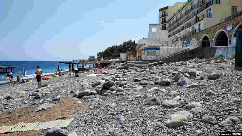 «Проход на причал закрыт» – такая табличка встречает отдыхающих на входе на «Золотой пляж» поселка городского типа Курпаты (Большая Ялта). Часть территории у моря здесь завалена бетонными плитами. Чуть поодаль – большое количество железобетонных волнорезов. Таким образом здесь спасают береговую линию от штормов.