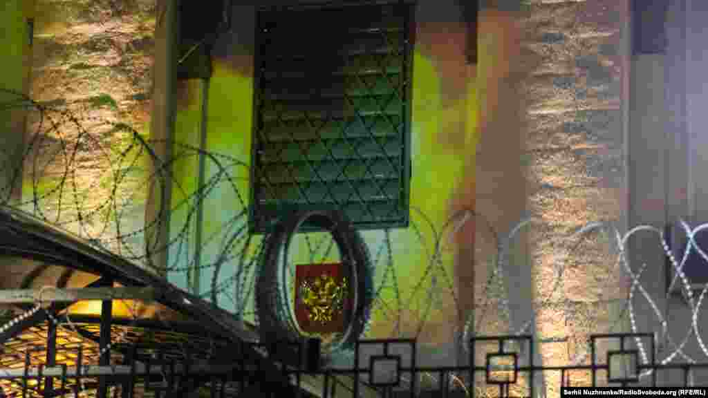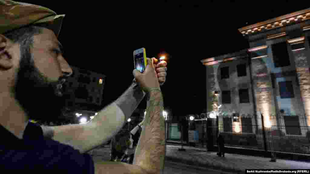 Здание посольства России в Украине в Киеве 25 мая подсветили языками пламени, изображением голодающего в России украинского режиссера Олега Сенцова и других политузников Кремля.