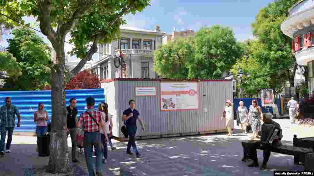 Движение на улице Пушкина в центре Симферополя заблокировано новым строительным забором. Еще в начале апреля на пересечении улиц Горького и Гоголя начали снимать дорожное покрытие и тротуарную плитку для замены коммуникаций. Сносу подлежат старые фонарные столбы, еще времен Австро-Венгрии, и некоторые аварийные деревья.