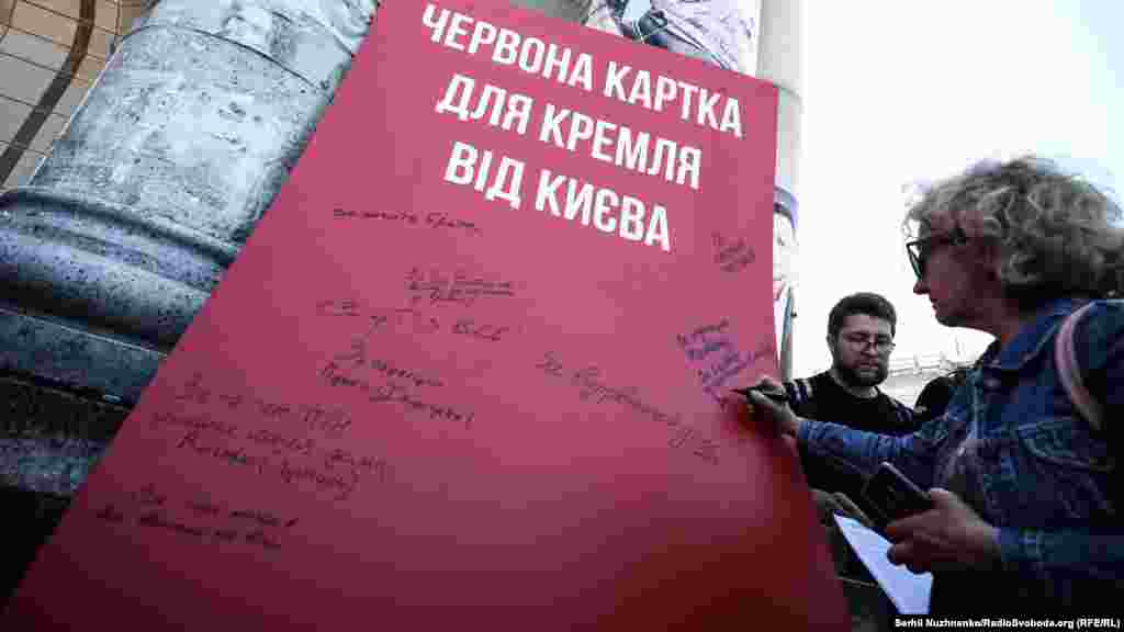 На Майдане Независимости в Киеве прошла акция «Спасем Олега Сенцова» (#SaveOlegSentsov). Основной лозунг акции – «покажи красную карточку Кремлю». Организаторы задумали ее в футбольной тематике, накануне Чемпионата мира, который в этом году будет проходить в России.