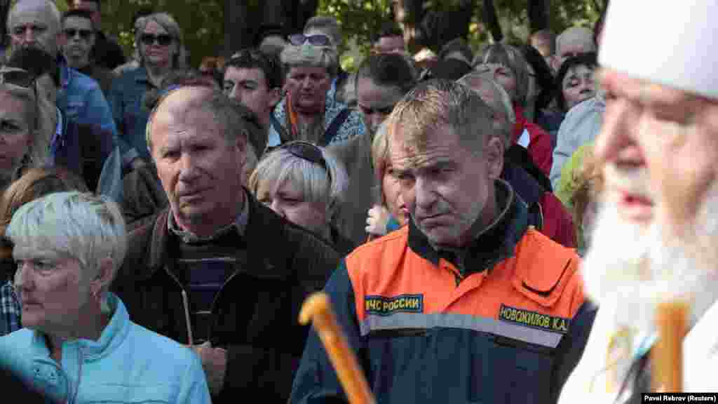 В Керчи около сотни человек собрались на молебен по погибшим в результате массового убийства в Керченском политехническом колледже. Рядом с учебным заведением установили импровизированный мемориал – черное полотно с фотографиями свечей и надписью «скорбим». С самого утра туда сходятся люди – несут цветы, свечи и мягкие игрушки. Там же церковнослужители читают литургийный молебен по погибшим.