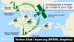 В 2014 году телевизионное вещание в Крыму было аналоговым и цифровым – в формате Т2. Из передающего центра в Киеве украинские телеканалы поднимались на европейский спутник Astra-1G (31,5° в. д.), а наземное оборудование принимало этот сигнал, после чего он раздавался через сеть эфирных передатчиков в цифровом формате Т2, и, в конце концов, оказывался на телеэкране крымчан.