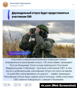 В других крымских сообществах администраторы выложили для обсуждения только отдельные тезисы из выступления президента РФ. Так, в евпаторийской группе «Евпатория Подслушано» заострили внимание на том, что участникам «СВО» будет предоставляться двухнедельный отпуск. Пост набрал 3,6 тыс просмотров, но только 12 комментариев.
