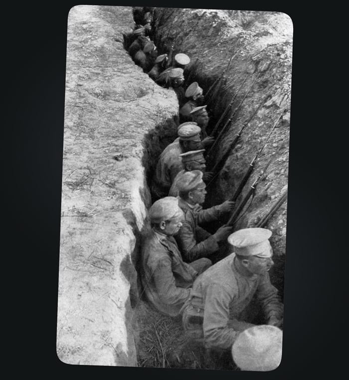 Торжественные проводы войск на фронт. Революция подорвала боевой дух армии. Дезертирство и бунты стали обычным делом. Комиссара Временного правительства, попытавшегося увещевать дезертиров, забили до смерти. К июлю от былых надежд на мир и народовластие не осталось и следа.