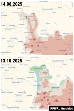 Дальше всего российская армия смогла продвинуться на южно-донецком направлении (собирательное название для стыка Запорожской, Днепропетровской и Донецкой областей). В сентябре, по данным DeepState, там ВС РФ удалось занять территории площадью почти в 130 квадратных километров (172 по подсчетам военного аналитика Конрада Музыки).