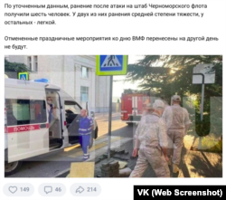 Группа «Черный список Севастополь» в соцсети «Вконтакте» сообщила: «Беспилотный летательный аппарат (БПЛА), предварительно украинский, атаковал штаб Черноморского флота в Севастополе, пять человек пострадали».
