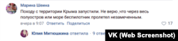 Пользователь Марина Шеина сомневается, что дрон прилетел с материковой части Украины: «... с территории Крыма запустили. Не верю, что через весь полуостров или море беспилотник пролетел незамеченным». Другие участники группы в ответах на ее комментарий тоже не сомневаются в этом. «Понятно, что с территории самого города», – пишет Юрий Переверзев.