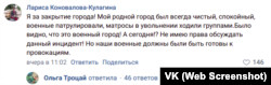 Алина Крылова сетует, что Севастополь не закрыли 24 февраля от беженцев с материковой Украины. Про «пятую колонну» украинцев в городе пишут другие участники группы в ответах на ее комментарий.