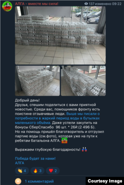 В соцсетях есть несколько групп, посвященных "Алге". Какие-то — на первый взгляд, близкие к властям, другие ведут родственники или бывшие бойцы батальона. Так, 30 июня в одном из Telegram-каналов писали, что передали на фронт посылку для "Алги": две небольшие коробки с газом в баллончиках, зажигалками, сигаретами, батарейками и беспроводными зарядками.
