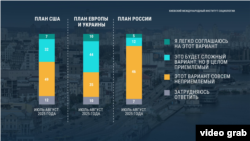 План от США – стало немного больше украинцев, которые готовы его принять, – 39%, в мае было 29%. Но всё равно больше украинцев, 49%, выступает и против плана США. В первую очередь, потому что он включает в себя снятие санкций с России, и это украинцам очень не нравится. Также он включает в себя международное признание со стороны США Крыма как части России.