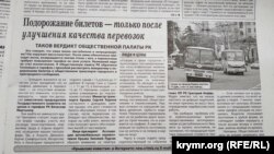 «Крымские известия» в публикации под заголовком «Подорожание билетов – только после улучшения качества перевозок» рассказывает о заседании подконтрольной России Общественной палаты Крыма, на котором рассматривался вопрос о подорожании билетов в общественном транспорте городского и пригородного сообщения. «Граждане жалуются на качество услуг, выпадение сел из графика движения, а перевозчики – на отсутствие возможностей его повысить, «сгустить» маршруты, – заявил зампредседателя российского Госкомитета по ценам и тарифам Крыма Вячеслав Мартынов. Чиновник считает: пора ввести новые тарифы, учесть все расходы транспортников, нормативы труда и отдыха водителей, оснащение машин тахографами. Так, в Алуште, Джанкое, Керчи, Симферополе, Феодосии, Ялте и Евпатории предлагается поднять тариф с 13 до 17 рублей. В Саках и Судаке – с 11 до 15, в Бахчисарае – с 12 до 15 рублей. «Разгорелись бурные споры между пассажирами, общественниками и перевозчиками. Первые сетовали на нарушение графика движения, грубость водителей. Перевозчики парировали, мол, из-за разбитых дорог выходит из строя техника, что и отражается на графике. А хамство – реакция на грубость льготников, они не ангелы и за словом в карман не лезут», – пишет газета. По итогам заседания принято следующее решение: «Совет Общественной палаты полагает возможным согласовать введение новых тарифов на пригородные перевозки и перевозку пассажиров в городском сообщении по муниципальным образованиям Крыма при соблюдении следующих условий: автобусы будут содержаться в чистоте, водители перестанут хамить пассажирам, курить, отказывать льготникам в проезде, осуществлять перевозку пассажиров в соответствии с утвержденным расписанием (уделив особое внимание перевозке в вечернее время), использовать имеющееся в автобусах оборудование (кондиционеры, печки, для комфорта пассажиров в автотранспорте будут установлены тахографы)».